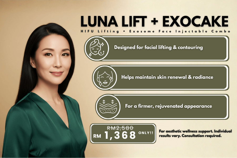 A clinician-led combo that pairs HIFU full face lifting (Luna Lift) with ExoCake exosome face injectable (150mg, 10bil) for lifting, contouring and skin renewal support.